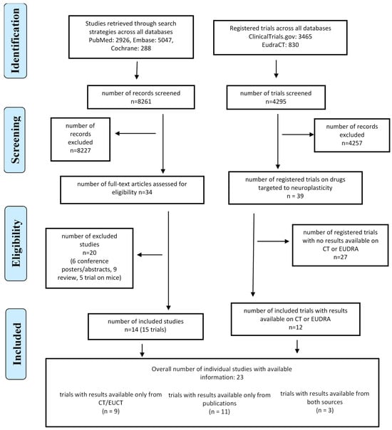 The first structured search was performed on registration databases ClinicalTrials.gov (CT) and the European Clinical Trials Register (EuCT) using the following search terms: (Alzheimer OR dementia OR MCI). The results were not limited based on status, study design, study phase, date of publication or language. Only studies investigating pharmacological compounds specifically targeting nicotinic receptors and enrolling participants with a diagnosis of any type of primary dementia or MCI were considered. The resulting list of registered trials was further analyzed to identify all trials with available results. Based on the list of molecules obtained from CT and EuCT, a specific structured search string was defined and adopted to perform bibliographic searches on databases PubMed, Embase and the Cochrane Library. The following terms were used: (dementia* OR Alzheimer* OR “mild cognitive impairment” OR MCI) AND (nicotin* OR Vareniclin* OR Champix OR GTS-21 OR DMXB-A OR DNBX-anabasein* OR EVP-6124 OR MT-4666 OR Enceniclin* OR ABT-089 OR Pozaniclin* OR ABT-126 OR Neloniclin* OR EVP-6124 OR AZD3480 OR Isproniclin* OR TC-1734 OR AZD-1480 OR SSR180711 OR Dimebon* OR Dimebolin* OR Latrepirdin* OR Pf-01913539 OR Simufilam* OR PTI-125, sumifilam* OR Nefiracetam* OR DM-9384 OR RO5313534 OR RG3487 OR MEM 3454). All literature up to May 31, 2023 was included. No limitations were applied in relation to the publication date, study design and language. Based on the results from both searches, a list of all trials with available results from any of the considered sources was defined, and the source of data was specified.