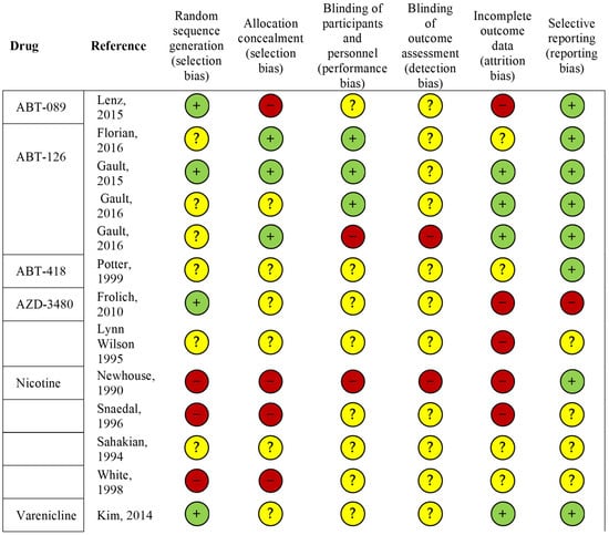 Assessment of the methodological quality was performed only for studies published in journal articles (Figure 2). The overall quality of the included studies was moderate to high. The main observed limitations included a lack of information on how the randomization process was conducted and incomplete data on the procedures for allocation concealment and blinding of outcome assessment. Moreover, most of the studies had limited sample sizes, such as one RCT on ABT-418 including 6 participants [], and were considered by the authors themselves as pilot studies. Moreover, some of the included studies did not report data on the characteristics of participants who were lost to follow-up, thereby preventing the assessment of whether participants who were lost to follow-up or who withdrew from the study were a selected population (e.g., older participants, more severe cases, etc.).