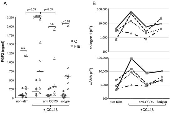 Fibroblasts were seeded at a density of 300.000 cells per well in a 6-well cell culture plate in Quantum 333 medium. Cells were allowed to attach overnight, and the medium was replaced with 1 mL of DMEM plus 10% FCS. Cells were either left non-stimulated or were stimulated with 10 ng/mL of CCL18. To block CCR6/CCL18 interaction, a blocking antibody against CCR6 (R&D systems, Wiesbaden, Germany, FRG) or an irrelevant antibody (mouse anti human IgG, R&D Systems) was added to a final concentration of 20 µg/mL in parallel cultures. After 24 h of culture, the supernatant was harvested and stored at −80 °C until FGF2 determination. FGF2 was measured using an ELISA development kit (R&D) and performed as suggested by the supplier.