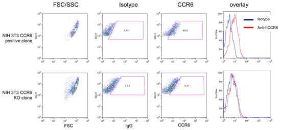 Approximately 50% of the mouse fibroblast line NIH 3T3 expressed CCR6 (Figure 5, upper panel), whereas the KO clone disclosed no difference to the control antibody indicating that there was no CCR6 expression (Figure 5, lower panel).