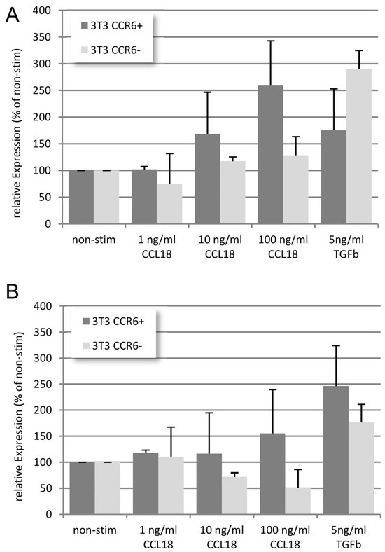 Fibroblasts are regarded as important drivers of fibrotic lung diseases [39], and CCL18 has been reported to foster collagen and αSMA expression in fibroblasts [30,40]. Thus, although we found CCR6 expression on several cell types within our fibrotic lung sections, we concentrate here on the role of the CCR6/CCL18 interaction in fibroblasts.