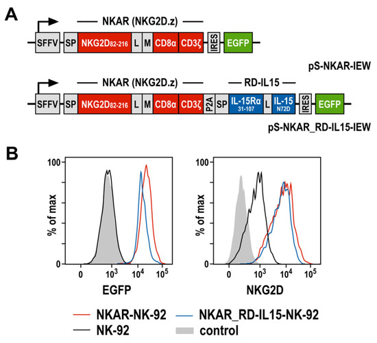 To target NKG2D ligands present on the surface of tumor cells, we previously generated an NKG2D-based chimeric antigen receptor (termed NKAR), which is composed of an immunoglobulin heavy-chain signal peptide, the NKG2D extracellular domain followed by a flexible linker and a Myc-tag, connected to the transmembrane and intracellular domains of CD3ζ by a modified CD8α hinge region [27]. To further optimize the lentiviral CAR construct, a sequence encoding the IL-15 superagonist RD-IL15 was fused to the NKAR sequence via a porcine teschovirus self-cleaving peptide (P2A) (Figure 1A). RD-IL15 consists of a second immunoglobulin heavy-chain signal peptide, the sushi domain of IL-15Rα, and affinity-optimized IL-15N72D [29,31]. VSV-G pseudotyped vector particles were generated and used for the transduction of NK-92 cells. The resulting NKAR-NK-92 and NKAR_RD-IL15-NK-92 cells were enriched by flow cytometric cell sorting based on their EGFP expression, and comparable levels of the NKAR on the cell surface were confirmed using an NKG2D-specific antibody (Figure 1B).