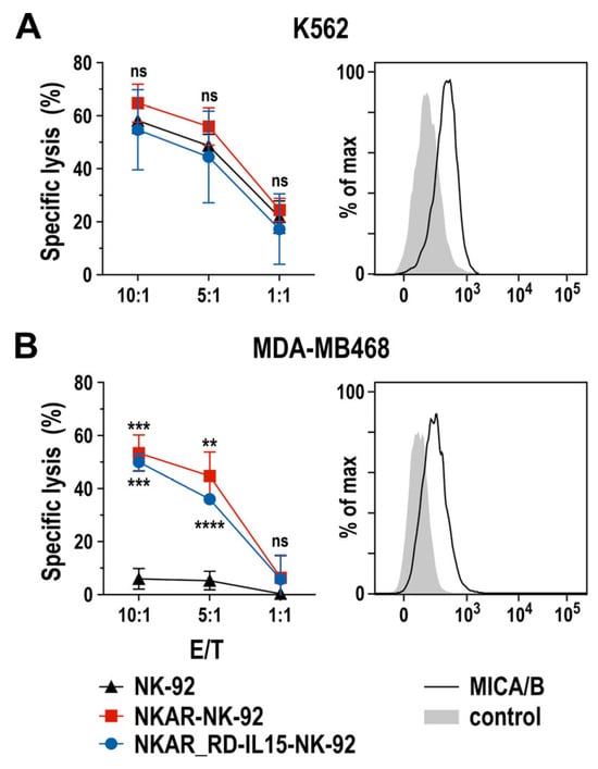 Cytotoxic activity of NKAR-engineered NK cells. Cell-killing of K562 erythroleukemia (A) and MDA-MB468 breast cancer cells (B) by NKAR-NK-92, NKAR_RD-IL15-NK-92 and parental NK-92 cells was investigated in flow cytometry-based cytotoxicity assays after co-incubation for 2 h at the indicated effector to target cell (E/T) ratios. Mean values ± SD are shown; n = 3 independent experiments. ****, p < 0.0001; ***, p < 0.001; **, p < 0.01; ns, p > 0.05 (not significant). The expression of NKG2D ligands on the surface of K562 and MDA-MB468 cells was confirmed by flow cytometry with MICA/B-specific antibody (black lines) as indicated. Unstained cells served as controls (filled gray areas).