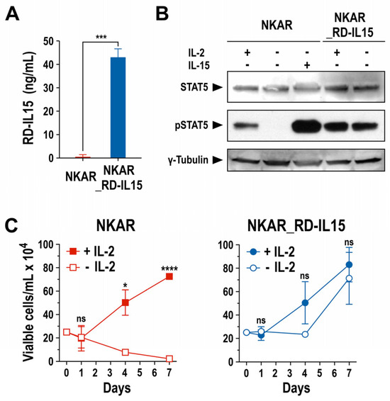 Biological activity of secreted IL-15 superagonist. (A) RD-IL15 secreted into the culture supernatant by NKAR_RD-IL15-NK-92 cells (blue bar) during a cultivation period of 3 days was measured by sandwich ELISA using an IL-15-specific capture antibody, and biotin-conjugated IL-15Rα-specific antibody and HRP-coupled streptavidin for detection. Recombinant His-tagged RD-IL15 was used as a standard for quantification. Culture supernatant from NKAR-NK-92 cells (red bar) served as a control. Mean values ± SD are shown; n = 3. ***, p < 0.001. (B) Lysates of NKAR-NK-92 and NKAR_RD-IL15-NK-92 cells cultured for 24 h in medium with or without IL-2 (100 IU/mL) or IL-15 (20 ng/mL) were subjected to SDS-PAGE and immunoblotting with antibodies specific for total and phosphorylated STAT5. γ-Tubulin served as a loading control. Uncropped images of the blots are shown in Supplementary Figure S7. (C) Proliferation of NKAR-NK-92 (left) and NKAR_RD-IL15-NK-92 cells (right) grown in medium with (filled symbols) or without (open symbols) IL-2 (100 IU/mL) for 7 days. Cell numbers were determined on days 0, 1, 4, and 7. Mean values ± SD are shown; n = 3 independent experiments. ****, p < 0.0001; *, p < 0.05; ns, p > 0.05 (not significant).