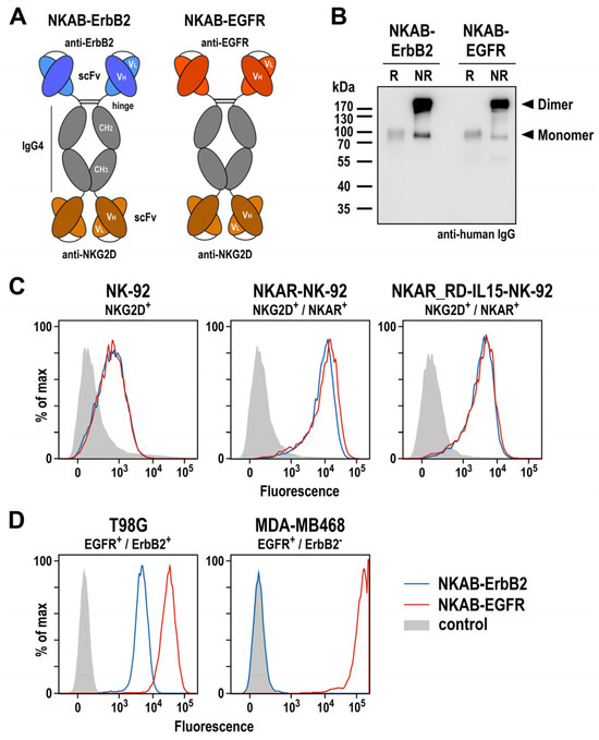 To specifically redirect lymphocytes endogenously expressing NKG2D or engineered with an NKG2D-based CAR to tumor cells with low or absent NKG2D ligand expression, we previously described different designs for bispecific molecules, which all reflect the structure and approximate size of IgG antibodies, but can simultaneously interact with NKG2D and the tumor-associated antigen ErbB2 (HER2) via respective single-chain fragment variable (scFv) antibodies connected by hinge, CH2, and CH3 domains of IgG4 [27]. Following the design of such an NKAB-ErbB2 molecule carrying the tumor-targeting domain at the N-terminus and the NKG2D-specific domain at the C-terminus, here, we generated a similar NKAB-EGFR antibody for the redirection of effector lymphocytes to tumor cells overexpressing epidermal growth factor receptor (EGFR) (Figure 4A). For specific tumor targeting, this molecule contains an scFv antibody fragment derived from monoclonal antibody 225, which has the same antigen binding site as the chimeric antibody cetuximab [37]. NKAB-EGFR and NKAB-ErbB2 were expressed as secreted proteins at high yields in transiently transfected Expi293F cells, and purified from culture supernatants by Protein G affinity chromatography. SDS-PAGE (Supplementary Figure S3) and immunoblot analysis of the purified antibodies with an IgG-specific antibody (Figure 4B) confirmed the identity of the recombinant proteins and their production predominantly as disulfide-linked homodimers, detected under non-reducing conditions.