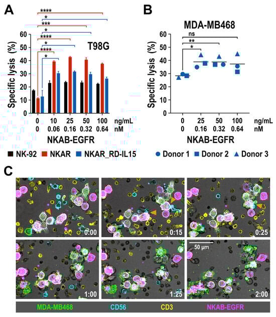 We previously demonstrated that recombinant NKAB-ErbB2 mediated high and tumor-cell-specific cytotoxicity of effector cells endogenously expressing NKG2D or engineered with the NKAR receptor [27]. To test whether this is also true for the newly generated NKAB-EGFR molecule, EGFR-positive T98G glioblastoma cells were co-cultured with NKAR-NK-92 and NKAR_RD-IL15-NK-92 cells for 3 h at an E/T ratio of 5:1 in the absence or presence of increasing concentrations of purified NKAB-EGFR antibody, before the specific lysis of target cells was determined by flow cytometry. Parental NK-92 cells were included for comparison. Thereby, NKAB-EGFR significantly increased target cell killing by NKAR-NK-92 and NKAR_RD-IL15-NK-92 cells in a dose-dependent manner, from 11.3% and 12.7% in the absence of the bispecific antibody up to a maximum of 42.7% and 31.7% lysis, respectively, which was reached at an NKAB-EGFR concentration of 0.16 nM (25 ng/mL) (Figure 5A). The cytotoxic activity of NKAR-NK-92 and NKAR_RD-IL15-NK-92 cells slightly decreased again if more NKAB-EGFR was present, likely due to a competition of productive cross-linking of effector and target cells by free antibody molecules. The addition of NKAB-EGFR also enhanced cell killing by parental NK-92 cells, albeit to a much lower degree, which can be explained by the cells’ moderate expression of endogenous NKG2D (see Figure 1B).