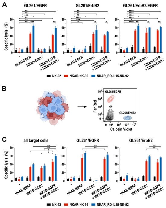 Activity of NKAB-EGFR and NKAB-ErbB2 against glioblastoma cells with heterogeneous target antigen expression. (A) Specific cytotoxicity of NKAR-NK-92 (red bars) and NKAR_RD-IL15-NK-92 cells (blue bars) against murine GL261 glioblastoma cells homogeneously expressing human EGFR, ErbB2, or both target antigens in the absence or presence of 0.16 nM (25 ng/mL) of NKAB-EGFR or NKAB-ErbB2, or a combination of 0.08 nM (12.5 ng/mL) of each molecule. Effector and target cells were co-cultured at an E/T ratio of 5:1 for 3 h. Parental NK-92 cells were included for comparison (black bars). (B) To assess the activity of the NKAB molecules against tumor cells with heterogeneous antigen expression, GL261/EGFR cells stained with Far Red (red) and GL261/ErbB2 cells stained with Calcein Violet (blue) were mixed at a 1:1 ratio before exposure to NK cells and bispecific antibodies. A representative contour plot identifying the different cell types by flow cytometry is shown on the right. (C) Specific cytotoxicity of NKAR-NK-92 (red bars) and NKAR_RD-IL15-NK-92 cells (blue bars) against mixed GL261/EGFR and GL261/ErbB2 glioblastoma cell cultures in the absence or presence of NKAB-EGFR or NKAB-ErbB2, or a combination of both molecules. The cell-killing experiments were performed as described in (A). Parental NK-92 cells were included for comparison (black bars). The panels depict the extent of specific lysis of all glioblastoma cells in the assay (left), or the individual GL261/EGFR (middle) and GL261/ErbB2 subpopulations (right). Mean values ± SD are shown in (A,C); n = 3 independent experiments. ****, p < 0.0001; ***, p < 0.001; **, p < 0.01; *, p < 0.05; ns, p > 0.05 (not significant).