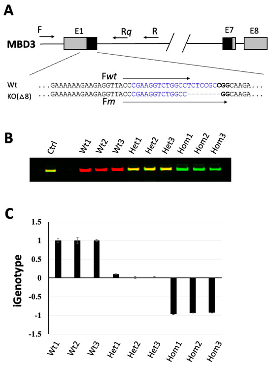 We previous established a competitive PCR method with dual fluorescent primers to specifically and reliably genotype animals with point mutations or short indels [28], where IR800 and IR700 fluorescent dyes were used to label the wild-type-specific (IR800-Fwt) and mutant allele-specific (IR700-Fm) primers, respectively, to competitively amplify from the common targeted region by pairing with a common primer (R) in a single-tube PCR system (Figure 1A, Table 1). In this competitive PCR system, the heterozygous animal produced a yellow band, while the bands for the wild-type and the homozygous mutant were red and green, respectively (Figure 1B) [28]. In addition to the competition of allele-specific primers for their allele-specific targets that improves PCR specificity, another important step for the competitive PCR system to be successful is that red and green fluorescent signals should be adjusted to be equal for the heterozygous template (thus producing a yellow band), indicating the importance to apply the heterozygous template as the common reference to normalize the allele-specific PCR amplification efficiencies for the wild-type and the mutant alleles, respectively. This prompted us to hypothesize that, if we use the heterozygous templates as the common standard DNA for quantification of the allele-specific PCR signals in a single sample in parallel qPCRs, where one qPCR is for the wild-type allele and the other qPCR for the mutant allele, we should be able to obtain distinct allele-specific PCR values in the sample for identifying its genotype. To simplify the determination of the genotype, we introduced a genotype index (iGenotype, see Section 2), which would theoretically generate indexes of 1, 0, and −1, from wild-type, heterozygous, and homozygous mutant targets, respectively, if the allele-specific primers for parallel qPCRs work perfectly. To test this, we amplified the target region of heterozygous MBD3-KO(∆8) genomic DNA by using primers F and R (Figure 1A) and serially diluted the PCR products to serve as the common standard DNA in parallel qPCR reactions. The parallel qPCR was set up by using the same forward primers, except nonfluorescent, as used in the competitive PCR with dual fluorescent primers for genotyping above, to pair with a new common reverse primer, Rq (Figure 1A, Table 1, Fw was identical to IR800-Fwt and the Fm was identical to IR700-Fm in sequences, respectively), on genomic DNA samples of three individual animals for each genotype, i.e., wild-type, heterozygous, and homozygous MBD3-KO(∆8), respectively. The results indicated that the qPCR-based iGenotype indexes were calculated to be approximately 1, 0.02~0.1, and −0.93~−0.97, for the wild-type, heterozygous, and homozygous mutant templates, respectively (Table 2), and easily allowed the identification of the genotypes (Figure 1C), even though the wild-type-specific qPCR also produced significant signals on the homozygous mutant templates in the qPCR (Table 2). Thus, the allele-specific primers-based parallel qPCR system could be a reliable assay to determine genotypes without a need for fluorescent primers, microscope, and scanners.