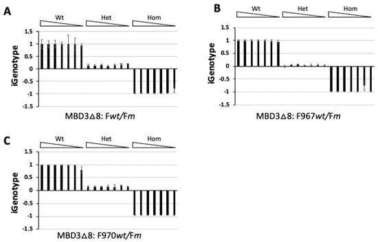 Having shown that the qPCR-based iGenotype indexes could faithfully identify all three genotypes of a gene targeted by genome editing, we next asked if the accuracy of this genotyping method could be affected by template concentration, as DNA isolation from tissue biopsies can vary. To investigate this, we amplified the MBD3 target region with primers F and R (Figure 1A) from wild-type, heterozygous, and homozygous MBD3-KO(∆8) mutant templates, respectively, purified and diluted the amplified DNA samples into 50 pg/μL each, then serially diluted them at 1:5 to serve as templates for the allele-specific qPCR analyses, as performed in Figure 1C. As shown in Figure 2A, the qPCR-based iGenotype indexes remained constant for each genotype within the wide concentration range tested for all three corresponding genotypes, suggesting that the qPCR-based iGenotype indexes could faithfully identify correct genotypes with great flexibility in template concentrations. To test if these observations apply to different primer sets in parallel qPCR analysis, we designed two alternative wild-type-specific primers, F967wt and F970wt (Table 1), to replace Fwt in qPCR paired with primer Rq, respectively, and evaluate the amounts of wild-type targets in the parallel qPCR analysis on the same samples used for Figure 2A, with the amounts of MBD3-KO(∆8) mutant targets that were still analyzed in qPCR using primers Fm and Rq. The results indicated that both alternative primers reproduced the same distinctive genotype-associated iGenotype indexes regardless of template concentrations (Figure 2B,C), suggesting that the iGenotype indexes for genotyping are flexible with primer designs.
