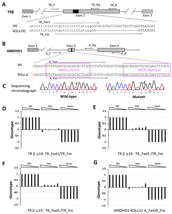 To investigate whether iGenotype indexes for genotyping could be applied to other genes, we tested them on two different mutant X. tropicalis lines: one with a 19-nucleotide deletion in the TRβ gene (TRβ∆19, Figure 3A) and another with a single-nucleotide deletion in the AMDHD1 gene (AMDHD1-KO(∆1), Figure 3B,C). We amplified the target region of an X. tropicalis TRβ mutant with a 19nt deletion (TRβ∆19) by using primers TR_F and TR_R (Table 1, Figure 3A) from templates of all three genotypes, respectively, purified and diluted into 4 pg/μL, then serially diluted at 1:5 to serve as templates in the parallel qPCR analysis, as done for the MBD3 gene above. Similarly, three alternative forward primers for the wild-type allele (TR_Fwt1~3) and one forward primer for the mutant allele (TR_Fm) were designed to pair with a common reverse primer (TR_Rq), respectively, in the parallel qPCR system for genotyping. As expected, all iGenotype indexes were converged to approximately 1, 0, and −1, respectively, on all concentrations of respective wild-type, heterozygous mutant, and homozygous mutant templates (Figure 3D–F; Supplemental Data S1), just like what we observed for MBD3-KO(∆8) targets above. For AMDHD1-KO(∆1), we amplified the target region by using primers A_F and A_R (Table 1, Figure 3B) from templates of all three genotypes, respectively, purified the DNA and diluted it into 10 pg/μL, then serially diluted it at 1:5 to serve as templates in parallel qPCR analyses, again as done for the MBD3 gene above. Due to limited choices of allele-specific primers differentiating the single-nucleotide deletion mutant, we designed one forward primer for the wild-type allele (A_Fwt) and one forward primer for the mutant allele (A_Fm), which had only a single different nucleotide primer sequence at the 3′-end, to pair with a common reverse primer (A_Rq), respectively, for the parallel qPCR system for genotyping. Consistently, all iGenotype indexes for the AMDHD1-KO(∆1) animals were converged to approximately 1, 0, and −1, respectively, on all concentrations of respective wild-type, heterozygous mutant, and homozygous mutant templates (Figure 3G; Supplemental Data S1). Taken together, these findings indicate that the genotype-associated iGenotype indexes can faithfully identify genotypes regardless of primer designs, template concentrations, or target regions with large or small indels including a single-nucleotide deletion, suggesting broad applications in genotyping genome-edited organisms.