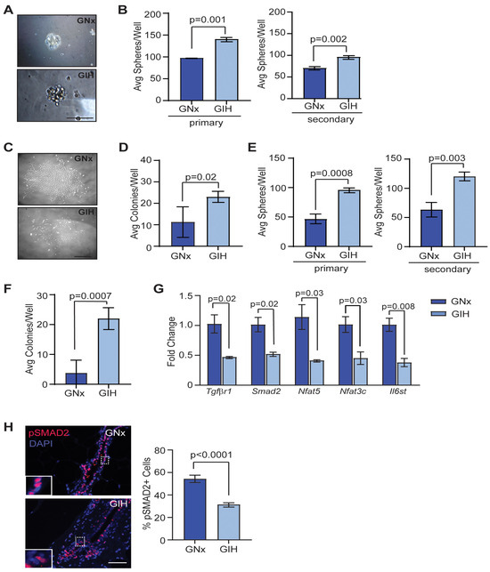 The most common types of breast cancer are thought to arise from mutations or epigenetic modifications in epithelial stem and progenitor cells, which may be acquired at key phases of rapid cell division, such as during in utero development or during puberty [19,20]. To investigate how GIH exposure impacts mammary stem and progenitor cells, we isolated mammary epithelial cells from GIH and GNx offspring and plated the cells in limiting dilution to measure mammospheres and colony formation. At 8 weeks, mammary epithelial cells from GIH offspring had formed significantly greater numbers of both primary and secondary mammospheres (Figure 2A,B). No differences were observed in the shape or size of the mammospheres. When plated on adherent plates coated in collagen, mammary epithelial cells isolated from GIH offspring demonstrated significantly enhanced colony formation (p = 0.02, Figure 2C,D). Although the colonies generated from the primary epithelial cells from each rat were variably sized, no differences were observed in colony size based on group. At 20 weeks, epithelial cells from GIH offspring also developed significantly more primary and secondary mammospheres (Figure 2E) as well as adherent colonies (p = 0.0007; Figure 2F).