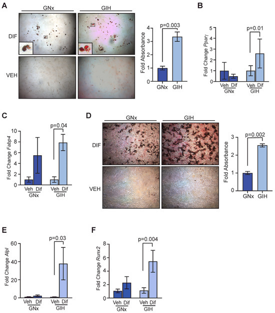 Adipose tissue, including subcutaneous adipose tissue in the mammary gland, contains a population of stem cells that have the ability to differentiate into mesenchymal cell lineages in response to different stimuli [26]. Given the changes in the mammary stroma that we observed in GIH offspring, we investigated whether there were also differences in this stem cell population between GNx and GIH offspring. We expanded the adipose-derived stromal cells from 20-week-old offspring in vitro. In response to adipogenic media, adipose-derived stromal cells from GIH offspring had significantly increased lipid droplets (p = 0.003, Figure 4A). Further, the expression of markers of adipocyte differenti ation, Pparγ (p = 0.01) and Fabp4 (p = 0.04), were significantly elevated in differentiated stromal cells from GIH offspring compared to undifferentiated control cells (Figure 4B,C). Similarly, in response to bone differentiation media, adipose-derived stromal cells from GIH offspring had significantly increased deposition of bone matrix (p = 0.002, Figure 4D). The expression of markers of bone differentiation Alpl (p = 0.03, Figure 4E) and Runx2 (p = 0.004, Figure 4F) was significantly higher in adipose-derived stromal cells from GIH offspring compared to undifferentiated controls.