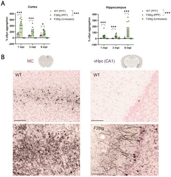 With the aim of studying αSyn pathology development and neurodegeneration in a model with accelerated αSyn aggregation, we seeded F28tg mice and cultures with PFFs generated from human αSyn. To support the hypothesis that PFF-induced αSyn aggregation is enhanced by the overexpression of human αSyn, we performed HTRF on in vivo samples (Figure 1A) and immunoblotting for the detection of triton-insoluble/SDS-extractable αSyn on in vitro PFF-treated cultures (Figure 5C) using antibodies that are cross-reactive with human and mouse αSyn. With both HTRF and immunoblotting, we observed increased αSyn aggregate formation in F28tg mice and cultures when compared to WT in support of the exacerbated αSyn aggregation being driven by the overexpression of human αSyn. Further supporting this, we detected the increased formation of pSer129-αSyn in the F28tg mice (Figure 1B) and cultures (Figure 5A–C) compared to WT. We speculate that the increased formation of αSyn aggregates in F28tg mice and cultures could be driven by the species compatibility between human PFFs and human αSyn expression, as demonstrated by others [34], and/or the increased levels of αSyn available for PFF-templated aggregation. While our data suggest that the overexpression of human αSyn increases seeded αSyn aggregation, it deserves to be mentioned that the relative quantification of pSer129-αSyn+ aggregates in F28tg and WT mice and cultures is limited by potential differences in the affinity of the anti-pSer129-αSyn antibody toward human and mouse pSer129-αSyn, the ability of mouse kinases and phosphatases to regulate the phosphorylation of aggregated human and mouse αSyn, and the susceptibility of human and mouse αSyn to C-terminal truncations that cleave off the pSer129 modification.