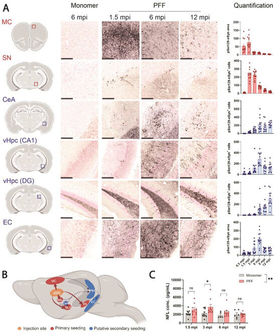 PFF injection induces progressive spread of pSer129-αSyn pathology in F28tg mice. (A) pSer129-αSyn pathology in MC, substantia nigra (SN), central nucleus of the amygdala (CeA), CA1 of the vHpc, dentate gyrus (DG) of the vHpc, and entorhinal cortex (EC) at selected time points following striatal injection of αSyn monomers or PFFs. pSer129-αSyn pathology was quantified as area (arbitrary units) of pSer129-αSyn staining (MC, EC) or number of pSer129-αSyn+ cells (SN, CeA, CA1, DG) at all time points (months post-injection, mpi), as shown on the right. Graphs show mean ± SEM of n = 11–13 mice/condition. Scale bar represents 200 μm. Illustrations on the left indicate the approximate location of the imaged region and were created with BioRender.com, (accessed on 20 October 2023). (B) Simplified drawing illustrating how αSyn aggregates might spread from the injection site (dorsal striatum, dStr) to primary seeding regions (red, plain arrows) and secondary seeding regions (blue, dotted arrows). Created with BioRender.com. Abbreviations not already mentioned: NAc, nucleus accumbens; BLA, basolateral amygdala; Hpc, hippocampus. (C) Neurofilament light-chain (NFL) levels in cerebrospinal fluid (CSF) from monomer- and PFF-injected F28tg mice at selected time points. Graphs show mean ± SEM of the responses from n = 9–10 (PFF) or n = 5–10 (monomer) mice per time point. Treatment groups were compared at all time points with two-way ANOVA followed by Šídák’s multiple-comparisons test. ns, p > 0.05; * p ≤ 0.05; ** p ≤ 0.01.