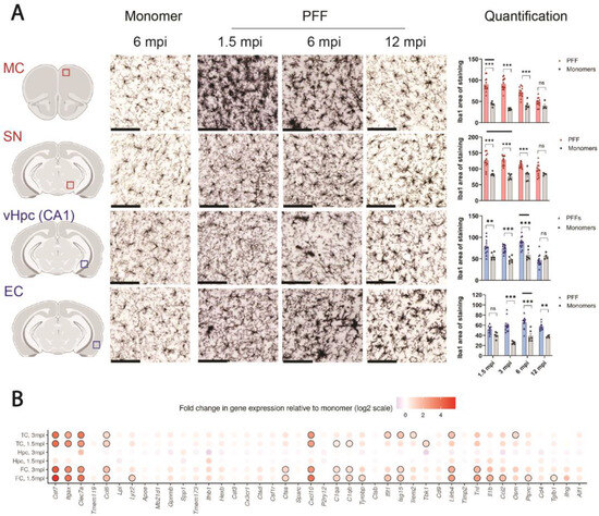 Microgliosis in the primary seeding regions of PFF-injected F28tg mice showed an overall good time- and brain-area-dependent correlation with the amount of pSer129-αSyn pathology (Figure 3A), indicating that microglia respond promptly to αSyn aggregation. Interestingly, at secondary seeding sites, we observed significant changes in Iba1 staining prior to extensive pSer129-αSyn pathology development (Figure 3A), potentially reflecting an early inflammatory response toward extracellular misfolded αSyn and/or factors released from the relatively few seeded neurons. To further characterize the inflammatory response in areas of αSyn aggregation, we analyzed the expression of selected neuroinflammation-relevant genes and found that the levels of several transcripts were significantly changed in the FC and TC, but not in the hippocampus (Figure 3B), where reactive microgliosis, evaluated histologically, was overall relatively mild, although significant when restricted to, e.g., the CA1 of the vHpc (Figure 3A). While one limitation of analyzing tissue in bulk is that it does not allow us to assign the changes in gene expression to certain cell types, it is an interesting notion that some of the most significantly changed genes in PFF-injected mice, e.g., Cst7, Itgax, Clec7a, and Lilrb4, are found to be expressed by disease-associated microglia in models of Alzheimer’s disease [51,52,53], suggesting that shared microglial responses exist between protein-misfolding diseases. Additionally, the upregulation of Clec7a, encoding the pathogen recognition receptor Clec7a, in microglia has recently been shown to promote neuroinflammation in a mouse model of Parkinson’s disease [54], while the roles of Cst7, Itgax, and Lilrb4 in relation to Parkinson’s disease remain to be further investigated. Furthermore, we found that Tnf was differentially expressed upon PFF treatment, consistent with published in vitro data from primary microglia [28]. Moreover, in agreement with previous in vitro data from astrocytes treated with conditioned media from PFF-treated microglia [28] or factors (Il-1α, C1q, TNFα) [55,56] known to be secreted by PFF-treated microglia [28], we found a strong PFF-induced upregulation of Cxcl10 in vivo, making it plausible that the observed changes in Cxcl10 expression, potentially driven by astrocytes, is induced by microglia.