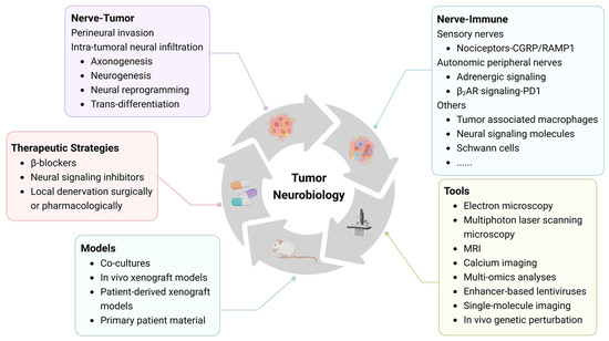 The study of nerve–cancer interactions relies on the development of imaging techniques and the establishment of in vitro and in vivo models. The rapid development of multi-omics analyses is also providing novel approaches to investigate the potential mechanisms at the molecular level. These research tools not only help to elucidate the nature of tumor neurobiology but also facilitate the clinical translation of nerve-specific treatment strategies.