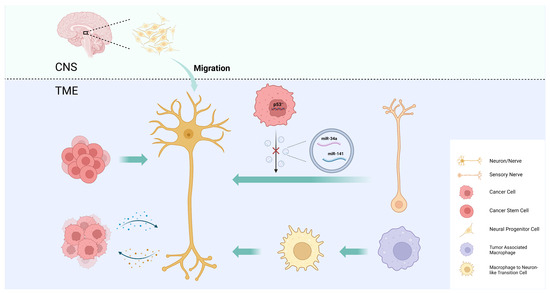 To explore the origin of newly formed adrenergic nerves in the TME of head and neck cancer, Amit et al. compared the transcriptome of tumor-associated trigeminal sensory neurons with that of endogenous neurons and revealed a phenotypic switch from sensory nerves to adrenergic neo-neurons induced by cancer-derived extracellular vesicles (EVs) [39]. This phenomenon has been linked to TP53, one of the most frequently mutated tumor suppressor genes in head and neck cancer, and its fluctuating expression is also closely associated with nerve regeneration [90,91]. In TP53-deficient tumors, a miRNA array analysis revealed a decrease in miR-34a and miR-141 in EVs, which caused an increase in the number of neurofilaments and promoted the axonogenesis of trigeminal ganglion neurons. The reduction in miR-34a also induced the transdifferentiation of sensory nerves towards adrenergic nerves [39]. By performing surgical sensory denervation and chemical sympathectomy prior to tumor cell inoculation in a mouse model, they showed that exosome-induced neural reprogramming, rather than the outgrowth of existing adrenergic nerves, promoted tumor proliferation and progression [39]. In conclusion, the study identified a novel mechanism of nerve–cancer interaction in head and neck cancer and proposed a potential strategy for anti-cancer therapy.