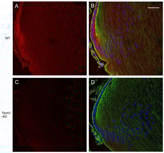 Immunofluorescence confocal microscopy of TRPM3 channels in the mature mouse lens. Representative immuno-fluorescent labeling of TRPM3 (red) in the wild-type lens (A,B) and Trpm3-KO lens (C,D) at P21 showing localization to the lens equatorial epithelium in (A,B) but not (C,D). Actin cytoskeleton and cell nuclei were labeled with phalloidin (green) and DAPI (blue), respectively. Scale bar: 50 µm.