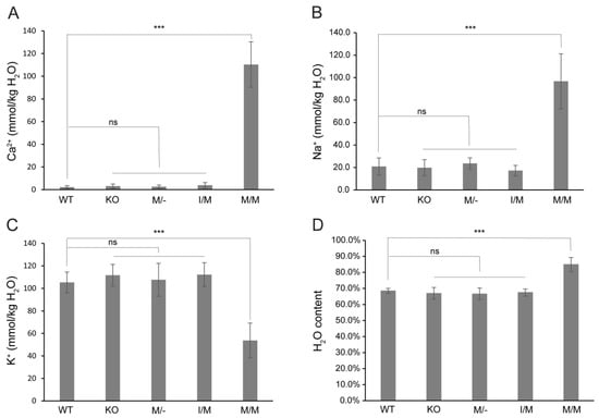 Cation and water content of Trpm3-mutant and Trpm3-KO lenses. Atomic absorption spectroscopy measurements of Ca2+ (A), Na+ (B), and K+ (C) concentrations and water content (D) in lenses (P21) from wild-type (WT), Trpm3-KO, hemizygous (M/−), heterozygous (I/M), and homozygous (M/M) Trpm3-mutant mice. *** p < 0.001; ns—not significant; error bars ± SD.