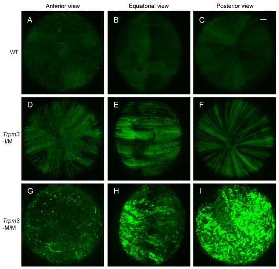 Elevated calcium in Trpm3-mutant lenses determined using a genetically encoded calcium sensor. Representative confocal fluorescence microscopy images of Cre-dependent GCaMP6s activation in wild-type (A–C), heterozygous Trpm3-I/M (D–F), and homozygous Trpm3-M/M (G–I) lenses at P21 showing anterior (A,D,G), equatorial (B,E,H), and posterior (C,F,I) views. Scale bar: 100 µm.