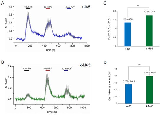 Cytoplasmic calcium responses in Fura-2-loaded HEK-293T cells that express either wild-type (I65) or mutant (M65) TRPM3 (k-isoform) channels. (A,B) Representative traces of Ca2+ transients evoked by 10 μM and 50 μM pregnenolone sulfate (PS) or by changes of extracellular Ca2+ (2 mM to 10 mM). Traces are averaged from cells in one region of interest expressing wild-type k-I65 (A) and mutant k-M65 (B) TRPM3 channels, respectively. (C) Ratio of peak Ca2+ influx in response to 50 μM PS versus 10 μM PS. (D) Peak Ca2+ influx in response to increase in extracellular Ca2+ concentration. ** p < 0.01; *** p < 0.001; error bars ± SD.