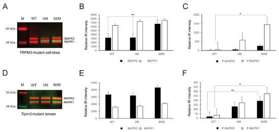 Since TRPM3-facilitated Ca2+ influx has been associated with the activation of mitogen-activated protein kinase-1 MAPK1/ERK2/p42 and MAPK3/ERK1/p44 in vitro [,], we performed immunoblot analysis to compare MAP kinase status in knock-in TRPM3-mutant HLE-B3 cell lines and Trpm3-mutant lenses versus wild-type lenses. Immunoblot analysis revealed that constitutive MAPK1 levels were significantly greater than MAPK3 levels in wild-type and heterozygous TRPM3-mutant (I/M) HLE-B3 cells, whereas constitutive MAPK3 levels were significantly elevated and similar to MAPK1 levels in homozygous TRPM3-mutant (M/M) HLE-B3 cells (Figure 7A,B). Moreover, phospho-activation of MAPK1 was significantly greater in TRPM3-M/M HLE-B3 cells compared to wild-type cells (Figure 7A,C). By contrast, constitutive MAPK3 levels were greater than MAPK1 levels in wild-type, Trpm3-I/M, and Trpm3-M/M lenses (Figure 7D,E), and phosphorylated MAPK1 and MAPK3 levels were both significantly elevated in Trpm3-M/M lenses compared to wild-type lenses (Figure 6D,F). Overall, while the relative basal levels of MAPK1 and MAPK3 differed between HLE-B3 cells and mouse lenses, phospho-activation of MAPK3 and/or MAPK1 was increased in the presence of mutant TRPM3 channels.