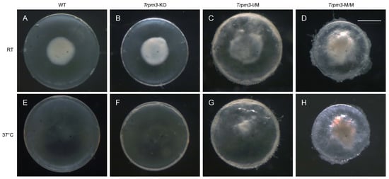 To determine the effects of the Trpm3 mutation versus Trpm3 deficiency on lens gene expression, we performed RNA-seq analysis to compare global transcriptional changes in Trpm3-mutant (I/M, M/M) lenses during early cataract development versus non-cataractous Trpm3-KO and wild-type lenses at P7. We selected lenses at P7 since resorption of the embryonic tunica vasculosa lentis (TVL) was largely complete, and at ages beyond P7, Trpm3-M/M lenses became severely opacified, fragile, and prone to rupture since they could not be cleanly dissected away from adherent contamination of other ocular tissues including the iris anteriorly and the retina posteriorly. During the dissection of P7 eyes at room temperature (20–22 °C), we observed so-called “cold cataract” formation in the core regions of wild-type, Trpm3-KO, and Trpm3-mutant lenses (Figure 8A–D). A cold cataract is a natural phenomenon of neonatal rodent lenses believed to result from changes in the supramolecular organization of specific lens proteins, including the beaded filament-specific proteins BFSP1 and BFSP2 [], which can be effectively reversed by warming to 37 °C (Figure 8E–H). Despite the role of TRPM3 in heat detection by sensory neurons [,], neither Trpm3 deficiency nor Trpm3 mutation appeared to impact the reversal of cold cataracts in the lens.