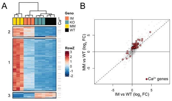 Gene expression changes in Trpm3-mutant and Trpm3-KO lenses using RNA-seq analysis. (A) Heatmap showing unique expression changes (≥2-fold) in Trpm3-mutant (I/M, M/M) and Trpm3-KO lenses compared to wild-type lenses at P7. (B) Scatterplot highlighting genes involved in Ca2+-associated processes (red) that are differentially expressed in Trpm3-I/M and Trpm3-M/M lenses.