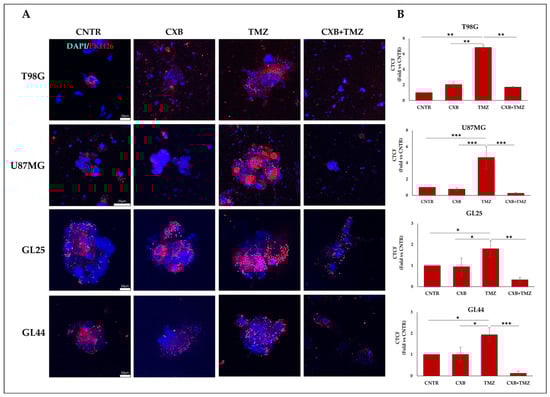 Detection of human macrophage cell line U937 in GBM spheres by confocal microscopy. (A) U937 were stained with PKH26 Red Fluorescent Cell Linker and cultured with adherent GBM cells previously exposed for 72 h to CXB, TMZ, or their combination until tumorsphere formation. Representative Z-stack projections of tumorspheres from T98G, U87MG, and primary cultures (GL25, GL44) after infiltration of PKH26-labeled macrophages (red) are shown. Dapi dye (blue) was used to counterstain nuclei. Images are from one of two independent experiments (magnification 63×). (B) Quantification of tumorsphere-infiltrating macrophages. For the quantification of the red fluorescence of PKH26-labeled macrophages, digital images were analyzed by ImageJ software. The red fluorescence intensity was expressed as the mean values of CTCF (corrected total cell fluorescence) ± SD and are expressed as the fold change vs. CNTR. A one-way ANOVA with a Tukey’s post hoc test was applied (* p < 0.05, ** p < 0.01, *** p < 0.001).