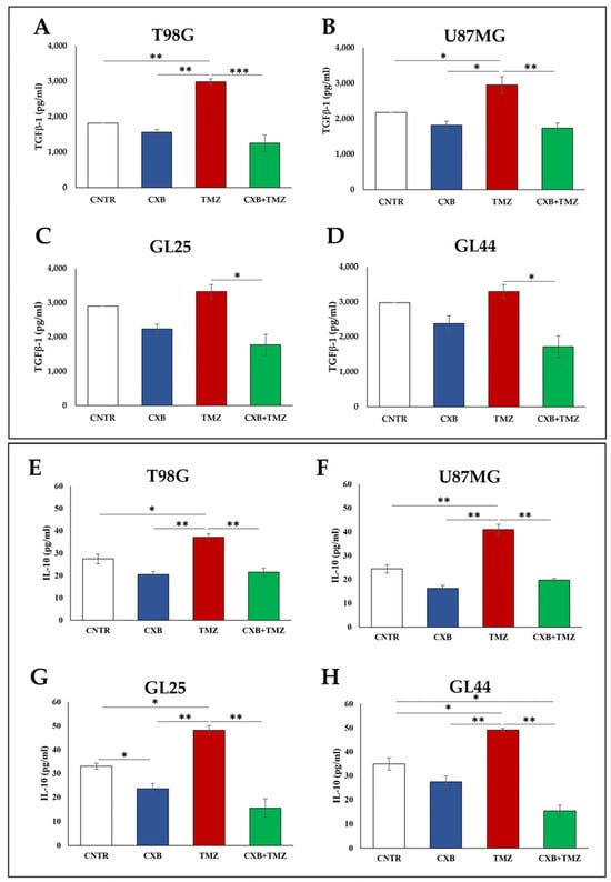M2-phenotypic shift after macrophage–tumorsphere interaction. GBM cells were treated with CXB, TMZ, and a drug combination for 72 h, then cultured in tumorsphere medium with macrophages. The levels of TGF-β1 and IL-10, M2-related markers, were assessed in coculture supernatants by ELISA (A–D and E–H, respectively). Data from three experiments are expressed as the mean ± SEM. A one-way ANOVA with a Tukey’s post hoc test was used (* p < 0.05, ** p < 0.01, *** p < 0.001).
