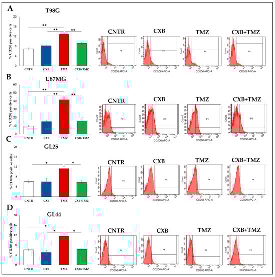 CD206 detection by flow cytometry. GBM cells were treated with CXB, TMZ, and a drug combination for 72 h, then cultured in tumorsphere medium with macrophages. The M2-differentiation marker, CD206, was evaluated by flow cytometry, and data were expressed as the percentage of CD206-positive cells (A–D). Data from two experiments are expressed as the mean ± SEM. One-way ANOVA with Tukey post-hoc test was used (* p < 0.05, ** p < 0.01). Flow cytometric profiles of CD206 positive cells from one representative experiment are also shown.
