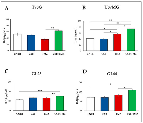 The content of interleukin-1β (IL-1β), a cytokine associated with the M1-activation state, was also measured in the supernatants of cell lines and primary cultures exposed to CXB, TMZ, or their combination in the presence of macrophages. CXB alone did not change IL-1β levels, while, when combined with TMZ, it could significantly increase the IL-1β secretion from all cells with respect to TMZ (Figure 4A–D).
