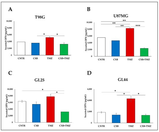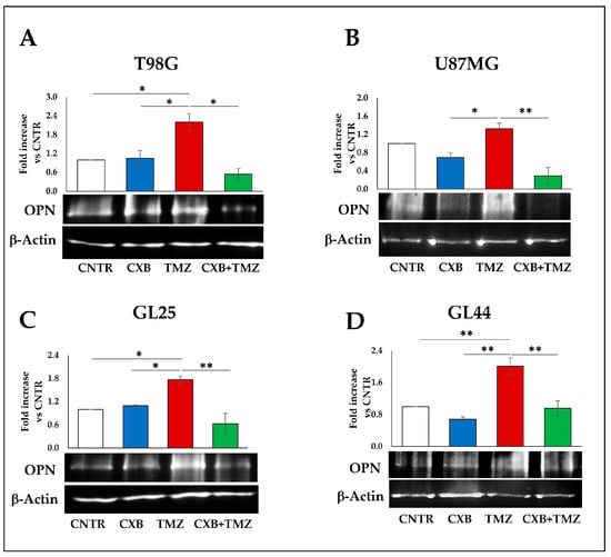 Representative Western blot images and the results from the densitometric analysis of OPN levels in GBM spheres from CXB-, TMZ-, and (CXB+TMZ)-treated cells are shown in Figure 6. In GBM cell lines, the OPN expression levels of the CNTR were not significantly affected by CXB, while the TMZ upregulated the OPN expression both in TMZ-partially resistant (U87MG) and TMZ-resistant (T98G) cell lines, and this increase was significant for T98G versus CNTR (Figure 6A,B). The combination CXB+TMZ significantly reduced the OPN expression with respect to TMZ alone, thus counteracting the TMZ effect in both cell lines (Figure 6A,B). In GBM primary cultures, GL25 and GL44, a similar trend was observed; in fact, the effect of TMZ, associated with an increase in OPN expression versus CNTR when used alone, was significantly counteracted by the concomitant exposure to CXB (Figure 6C,D).