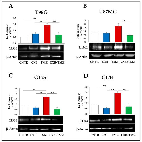 COX-2 inhibition counteracted the TMZ-induced CD44 upregulation. Immunoblotting assays for CD44 were performed on T98G, U87MG (A,B), and primary cultures (C,D) previously treated for 72 h with CXB, TMZ, or their drug combination and cultured with macrophages in GSC medium to generate tumorspheres. β-Actin was used as a loading control for normalization. Representative images are shown (CD44 80 kDa, β-Actin 42 kDa). Values are expressed as the fold increase versus CNTR (mean ± SEM) of three independent experiments. A one-way ANOVA with a post hoc Tukey’s test was used (* p < 0.05, ** p < 0.01).