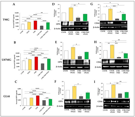 Aiming to better define the COX-2 role in TMZ resistance, the effect of exposure to exogenous PGE2 was evaluated on OPN and CD44 levels of T98G and U87MG, and GL44 in the presence of macrophages. Since primary cultures showed a similar trend, we selected GL44 to evaluate the effect of exogenous PGE2. The PGE2 addition significantly enhanced the secreted OPN in T98G and U87MG but not in GL44 compared to CNTR (Figure 8A–C). Interestingly, in T98G, U87MG, and GL44, the exogenous PGE2 significantly enhanced the OPN levels in CXB+TMZ-treated cells (green bar) with respect to the drug combination treatment (grey bar) (Figure 8A–C). A similar trend was observed in Western blotting: PGE2 alone strongly enhanced the OPN protein levels, and when added to CXB+TMZ-treated cells, a re-established expression of OPN was detected in GBM cell lines as primary culture even if it was not significant (Figure 8D–F). Additionally, exogenous PGE2 upregulated the CD44 expression compared to CNTR and significantly counteracted the effect of the drug combination in T98G and U87MG spheres (Figure 8G,H). A lower cellular response to the PGE2 addition in CD44 expression was observed in GL44 cells (Figure 8I).