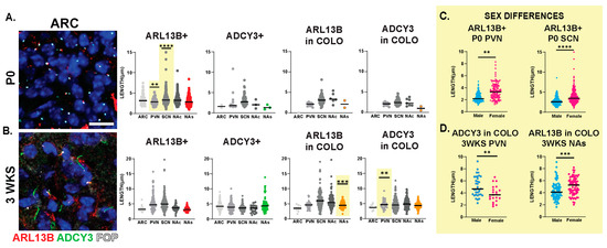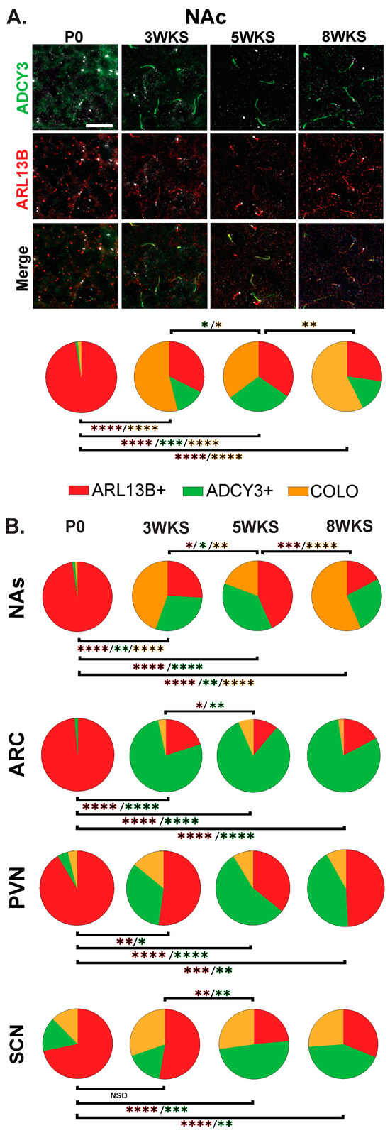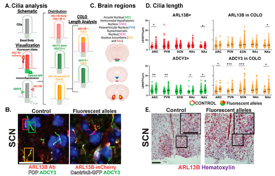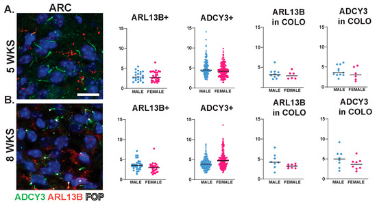 Brewer, K.K.; Brewer, K.M.; Terry, T.T.; Caspary, T.; Vaisse, C.; Berbari, N.F. Postnatal Dynamic Ciliary ARL13B and ADCY3 Localization in the Mouse Brain. Cells 2024, 13, 259. https://doi.org/10.3390/cells13030259