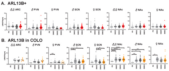 3.4. Cilia Signatures in the Brain at Different Postnatal Developmental Ages