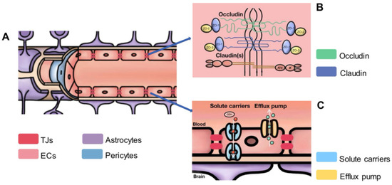 The BBB and its detailed molecular components: (A) longitudinal profile of the BBB; (B) the TJPs, including occludin and claudin, contribute to the integrity of the BBB; (C) transport mechanisms, such as solute carriers and efflux pumps, actively regulate the passage of substances, emphasizing the BBB’s vital role in maintaining the brain’s stability.