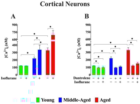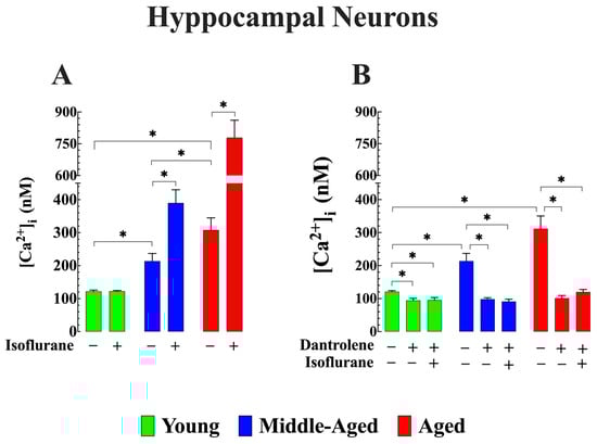 - In vivo and in vitro exposure to isoflurane led to a significant increase in [Ca2+]i in middle-aged and aged cortical and hippocampal neurons but did not affect neuronal [Ca2+]i in young mice. However, dantrolene treatment reduced the basal level of [Ca2+]i across all age groups and prevented or reduced the elevation of [Ca2+]i associated with exposure to isoflurane in middle-aged and aged neurons.