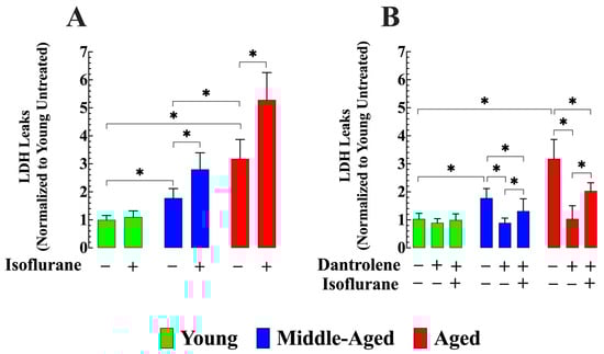 - Middle-aged and aged hippocampal pyramidal neurons had higher ROS production, elevated calpain activity, and increased LDH leak compared to young neurons. These age-related changes were mitigated by dantrolene treatment. The administration of isoflurane further increased all three parameters over base levels, but pretreatment with dantrolene prevented or attenuated the effects of isoflurane.