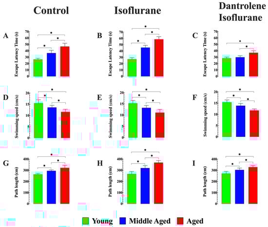 3.7. Dantrolene Enhances Cognitive Function and Prevents Isoflurane-Induced Further Decline in Aged Mice