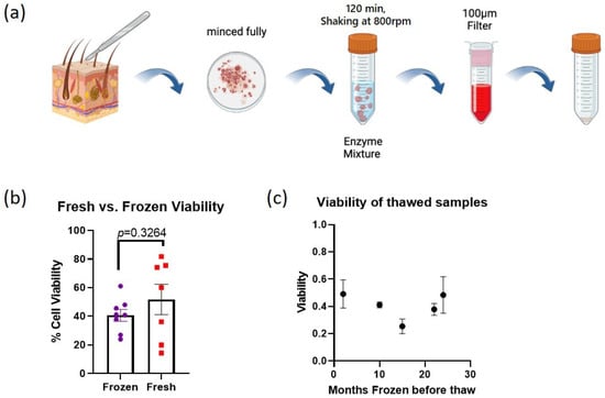 Comparison of fresh and frozen cell viability using the simultaneous digestion method. (a) Graphical depiction of the simultaneous skin digestion method. (b) Comparison of the average percent cell viability (# live cells/# total cells) between fresh (N = 7) and frozen samples (N = 8). (c) Relationship between months stored at −150 °C and the cell viability upon thaw (averages of two technical replicates are shown). Error bars indicate SEM.