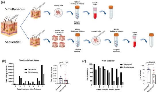 Comparison of cell isolation counts and viability between sequential and simultaneous digestion methods on fresh skin samples. (a) Graphical comparison of the simultaneous and sequential digestion methods. (b) Total cells/g of tissue isolated from the same patient using either the sequential or simultaneous digestion method (left). The average across 7 samples is also shown (right, N = 7, paired t-test, difference not significant). (c) Separated by patient (left) and average (right, N = 7, paired t-test p = 0.0089) percent cell viability (# live cells/# total cells) between sequential and simultaneous digestion methods. Error bars show SEM.