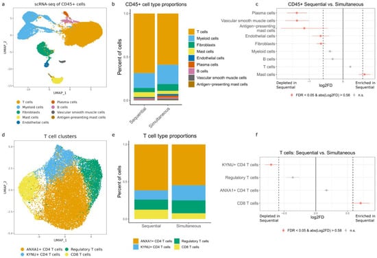 Single-cell RNA-seq analysis of CD45+ cells isolated from fresh tissue samples. (a) UMAP plot of 29,647 annotated CD45+ cells colored by cell type. (b) Stacked bar plot showing the relative proportions of each CD45+ cell type split by digestion method. (c) Relative differences in cell proportions for each CD45+ cluster, comparing sequential and simultaneous digestion methods. Red clusters are statistically significant (FDR < 0.05 and absolute log2 fold change > 0.58). Larger log2 fold changes indicate a higher proportion of cells in the sequential method. (d) UMAP plot of 19,357 T cells colored by cell type. (e) Stacked bar plot showing the relative proportions of each T cell type split by digestion method. (f) Relative differences in cell proportions for each T cluster, comparing sequential and simultaneous digestion methods. Red clusters are statistically significant (FDR < 0.05 and absolute log2 fold change > 0.58). Larger log2 fold changes indicate a higher proportion of cells in the sequential method.