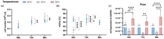 The analysis revealed increasing cell numbers over time at all three temperatures (Figure 1a). While no cell number differences were detectable after 48 h of culture, the cells cultured at 28 °C were significantly higher in number than that of the 25 °C group after 72 h, and significantly higher than those of the two colder temperatures after 96 h (all p < 0.001). At all temperatures and cultivation times, the cell vitality was above 90% (Figure 1b). The lowest vitality was present in the 25 °C group after 48 h. After 72 h, the vitality was still the highest in the 28 °C group (97.5%), followed by the 20 °C group (95.5%) and the 25 °C group (93.8%). The cell number results correlated with the gene expression analysis of pcna, which serves as a proliferation marker (Figure 1c). Analogous to cell numbers, the increase in culture temperature from 20 °C to 25 °C did not affect relative pcna expression levels at all three time points, although a tendency to decline was observed. Compared to the 20 °C control group, pcna expression in the 28 °C group increased significantly at 48 h and 96 h incubation. As pcna expression tended to decrease in the 25 °C group, the expression levels in the 28 °C group were significantly higher than the 25 °C group at all time points (p < 0.01, Figure 1c).
