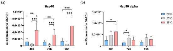 In the next step, the expressions of the heat shock proteins 70 (hsp70) and 90 alpha (hsp90a) were analyzed. The profile of hsp70 expression was very similar to that of vim (Figure 3c). The expression of hsp70 remained constant over time in the control group (Figure 4a). There were no significant differences between cells cultured at 20 °C and 25 °C for all three time points. However, hsp70 expression in the 28 °C group was always significantly higher than that of the cells at lower temperatures (p < 0.01).