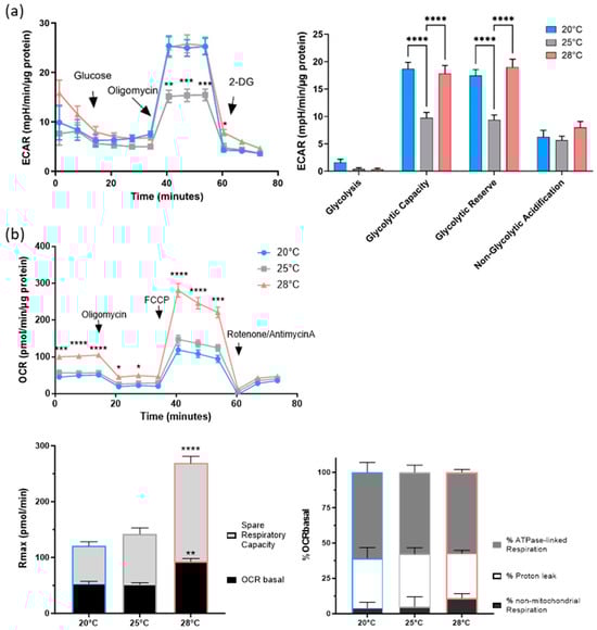 Bioenergetic parameters of AOXlar7y cells incubated at 20 °C (blue), 25 °C (grey), and 28 °C (red). Cells were cultivated at a density of 10,000 cells per well in ten technical replicates for six hours for cell attachment before performing the (a) glycolysis stress test and (b) Mito Stress test. All measured values were normalized to protein content. (a) The extracellular acidification rates (ECAR) of the cells were measured under starvation and after glucose, oligomycin, and 2-deoxyglucose (2-DG) administration (indicated by arrows). Glycolysis, glycolytic capacity and reserve, and non-glycolytic acidification were calculated using normalized ECAR values obtained with WAVE software (version 2.6.1). (b) The oxygen consumption rates (OCR) were first measured under basal conditions and then after applying various inhibitors of mitochondrial respiratory chain components (oligomycin, FCCP, and rotenone/antimycin A) at the time points indicated by an arrow. The maximal respiration (Rmax) is composed of OCRbasal and spare respiratory capacity. The percentages of ATP synthase-linked respiration, proton leak, and non-mitochondrial respiration from basal respiration were calculated using normalized OCR values obtained with WAVE software (version 2.6.1). Two-way ANOVA and Šídák’s multiple comparisons test were performed for statistical analysis. * p < 0.05, ** p < 0.01, *** p < 0.001, **** p < 0.0001, (a) 20 °C and 28 °C vs. 25 °C and (b) 20 °C and 25 °C vs. 28 °C.