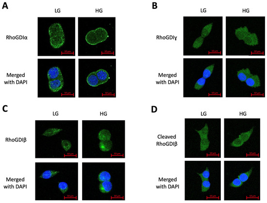 Confocal imaging analysis of the expression of RhoGDIα, RhoGDIγ, and RhoGDIβ (full-length and cleaved forms) in INS-1 832/13 cells. Representative confocal images displaying the expression and subcellular distribution of RhoGDIα (A), RhoGDIγ (B), full-length RhoGDIβ (C), and cleaved RhoGDIβ (D) using FITC conjugated secondary antibody (green) in INS-1 832/13 cells exposed to either basal (LG; 2.5 mM) or high-glucose (HG; 20 mM) conditions for 24 h, as described in the text. DAPI is shown as a marker for the nuclear association (blue). Images shown are representative of 2 independent confocal studies.