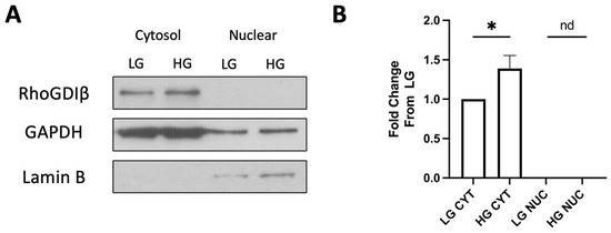 The data shown in Figure 5B appear to suggest that RhoGDIγ is diffusely distributed throughout the cell under both basal and hyperglycemic exposure conditions with no evidence of colocalization with DAPI (i.e., nuclear association). Interestingly, however, we noticed that hyperglycemic conditions facilitate the association of RhoGDIβ (full-length) in the perinuclear region (Figure 5C) and RhoGDIβ in the cleaved form (i.e., increased granularity in the DAPI stained region; Figure 5D). Together, these findings appear to provide directional, but not definitive, evidence for a potential association between RhoGDIβ (full-length and cleaved forms), but not RhoGDIα or RhoGDIγ, and the nuclear compartment.