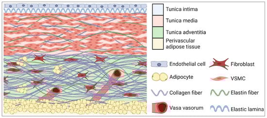 The aortic wall is built of three layers: outer or adventitia, middle or media and inner or intima (Figure 1). The intima is composed of single endothelial cells, which are located on areolar connective tissue. The intima plays an important role in intercellular signaling, and it contributes to the expression of proinflammatory cytokines, which can modulate immune cell activity [19]. The media is composed of smooth muscle, elastin and collagen fibers which provide aorta elasticity and contractility. The adventitia is constituted mainly of fibroblasts, which produce ECM fibers. The adventitia provides strength and prevents the excess stretching of the aortic wall. In this layer there are also vascular vessels (Latin: vasa vasorum) which are predisposed to adventitial inflammation [20]. The superficial layer of all types of vessels, except cerebral and pulmonary, is covered with a layer of perivascular adipose tissue (PVAT). In physiology conditions, the role of PVAT is to take part in regulating vascular tension, thermoregulation and the releasing of molecules influencing metabolism and the proliferation of VSMCs [21]. An overgrown PVAT layer is suggested as a direct factor responsible for the development of obesity-related CVDs [22].
